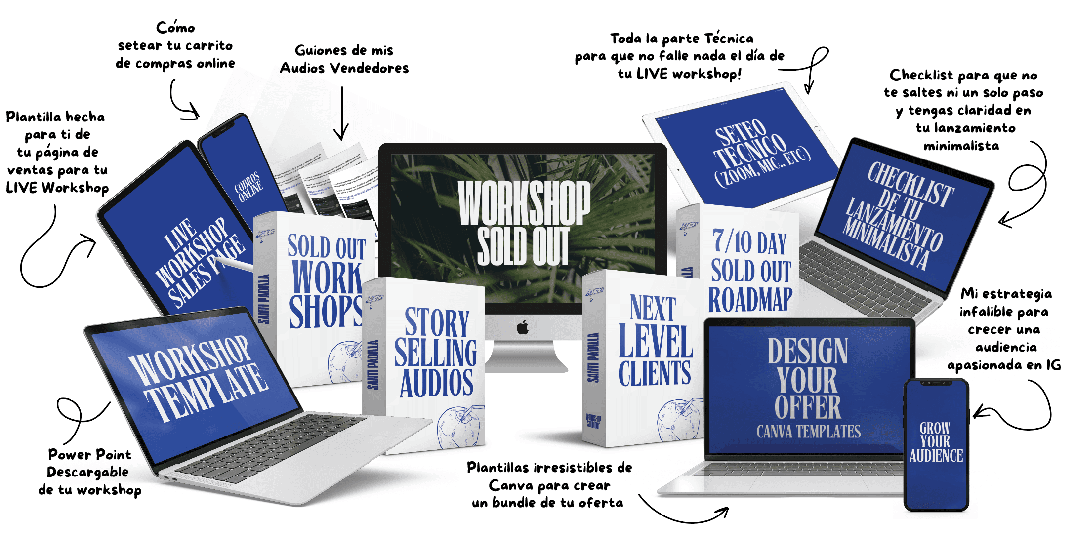 Buena pregunta! La estrategia de "The Workshop Method" me cambió la vida y sigue funcionando, pero "Workshop Sold Out" se trata de rapidez... Cómo puedes lanzar y agotar tu taller esta misma semana. Suelo vender los primeros 100 tickets en menos de 30 minutos.